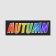This fun, vibrant, multicolored name tag design features the common first name "AUTUMN", with the letters of the name having a colourful rainbow spectrum like gradient colouring pattern, on a black coloured background. A nametag like this might be worn by a staff member, an employee, or a volunteer whose given name is Autumn, to help identify the wearer to customers or other people. [~Z0000344]