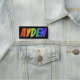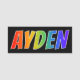This fun, vibrant, multicolored name tag design features the common first name "AYDEN", with the letters of the name having a colourful rainbow spectrum like gradient colouring pattern, on a black coloured background. A nametag like this might be worn by a staff member, an employee, or a volunteer named Ayden, to help identify the wearer to customers or other people. [~Z0000344]