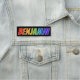 This fun, vibrant, multicolored name tag design features the common first name "BENJAMIN", with the letters of the name having a colourful rainbow spectrum like gradient colouring pattern, on a black coloured background. A nametag like this might be worn by a customer service representative, an employee, or a staff member whose name is Benjamin, to help identify the wearer to customers or other people. [~Z0000344]