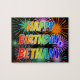 This vibrant and fun birthday-themed jigsaw puzzle design has the message "HAPPY BIRTHDAY, BETHANY" having a colourful rainbow spectrum inspired gradient pattern, and a lively bursting celebratory fireworks inspired background pattern. A colourful puzzle like this might be a fun way to send birthday wishes to somebody named Bethany. [~Z0000465]
