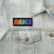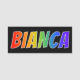 This fun, vibrant, multicolored name tag design features the common first name "BIANCA", with the letters of the name having a colourful rainbow spectrum like gradient colouring pattern, on a black coloured background. A nametag like this might be worn by a staff member, a customer service representative, or a volunteer who is named Bianca, to help identify the wearer to others. [~Z0000344]