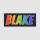 This fun, vibrant, multicolored name tag design features the common first name "BLAKE", with the letters of the name having a colourful rainbow spectrum like gradient colouring pattern, on a black coloured background. A nametag like this might be worn by a customer service representative, a staff member, or a volunteer whose name is Blake, to help identify the wearer to customers or other people. [~Z0000344]