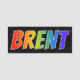 This fun, vibrant, multicolored name tag design features the common first name "BRENT", with the letters of the name having a colourful rainbow spectrum like gradient colouring pattern, on a black coloured background. A nametag like this might be worn by a staff member, an employee, or a customer service representative whose name is Brent, to help identify the wearer to others. [~Z0000344]