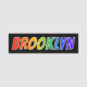 This fun, vibrant, multicolored name tag design features the common first name "BROOKLYN", with the letters of the name having a colourful rainbow spectrum like gradient colouring pattern, on a black coloured background. A nametag like this might be worn by a volunteer, a staff member, or a customer service representative whose name is Brooklyn, to help identify the wearer to others. [~Z0000344]