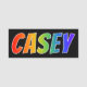 This fun, vibrant, multicolored name tag design features the common first name "CASEY", with the letters of the name having a colourful rainbow spectrum like gradient colouring pattern, on a black coloured background. A nametag like this might be worn by an employee, a customer service representative, or a volunteer who is named Casey, to help identify the wearer to others. [~Z0000344]