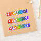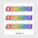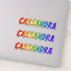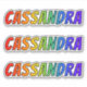 This vibrant, exciting, and fun sticker design features the common first name or given name "CASSANDRA", with the letters of the name having a colourful rainbow spectrum inspired gradient colouring pattern. It might be a fun gift to give to somebody whose first name is Cassandra. [~Z0000361]