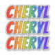 This exciting, multicolored, and fun sticker design features the common first name or given name "CHERYL", with the letters of the name featuring a colourful rainbow spectrum like gradient colouring pattern. It might be a fun present to give to somebody named Cheryl. [~Z0000361]
