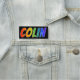 This fun, vibrant, multicolored name tag design features the common first name "COLIN", with the letters of the name having a colourful rainbow spectrum like gradient colouring pattern, on a black coloured background. A nametag like this might be worn by an employee, a staff member, or a volunteer who is named Colin, to help identify the wearer to others. [~Z0000344]