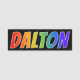 This fun, vibrant, multicolored name tag design features the common first name "DALTON", with the letters of the name having a colourful rainbow spectrum like gradient colouring pattern, on a black coloured background. A nametag like this might be worn by a customer service representative, a staff member, or a volunteer whose given name is Dalton, to help identify the wearer to others. [~Z0000344]