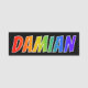 This fun, vibrant, multicolored name tag design features the common first name "DAMIAN", with the letters of the name having a colourful rainbow spectrum like gradient colouring pattern, on a black coloured background. A nametag like this might be worn by a volunteer, an employee, or a customer service representative whose first name is Damian, to help identify the wearer to others. [~Z0000344]