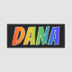 This fun, vibrant, multicolored name tag design features the common first name "DANA", with the letters of the name having a colourful rainbow spectrum like gradient colouring pattern, on a black coloured background. A nametag like this might be worn by an employee, a customer service representative, or a volunteer who is named Dana, to help identify the wearer to customers or other people. [~Z0000344]