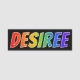 This fun, vibrant, multicolored name tag design features the common first name "DESIREE", with the letters of the name having a colourful rainbow spectrum like gradient colouring pattern, on a black coloured background. A nametag like this might be worn by a volunteer, an employee, or a customer service representative whose given name is Desiree, to help identify the wearer to others. [~Z0000344]