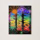This fun, lively, birthday-themed jigsaw puzzle design features the message "HAPPY BIRTHDAY, DONALD" having a colourful rainbow spectrum inspired gradient pattern, and a vibrant bursting celebratory fireworks inspired background pattern. A vibrant puzzle like this might be a fun way to send a birthday greeting message to somebody named Donald. [~Z0000465]