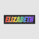This fun, vibrant, multicolored name tag design features the common first name "ELIZABETH", with the letters of the name having a colourful rainbow spectrum like gradient colouring pattern, on a black coloured background. A nametag like this might be worn by a volunteer, a staff member, or an employee whose first name is Elizabeth, to help identify the wearer to others. [~Z0000344]