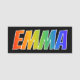 This fun, vibrant, multicolored name tag design features the common first name "EMMA", with the letters of the name having a colourful rainbow spectrum like gradient colouring pattern, on a black coloured background. A nametag like this might be worn by a staff member, a volunteer, or a customer service representative whose given name is Emma, to help identify the wearer to others. [~Z0000344]