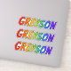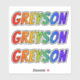 This vibrant, multicolored, and exciting sticker design features the common first name or given name "GREYSON", with the letters of the name featuring a colourful rainbow spectrum like gradient colouring pattern. It might be a fun present to give to somebody named Greyson. [~Z0000361]