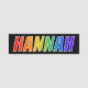 This fun, vibrant, multicolored name tag design features the common first name "HANNAH", with the letters of the name having a colourful rainbow spectrum like gradient colouring pattern, on a black coloured background. A nametag like this might be worn by an employee, a customer service representative, or a staff member whose name is Hannah, to help identify the wearer to others. [~Z0000344]