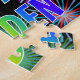This vibrant, lively, birthday-themed jigsaw puzzle design has the message "HAPPY BIRTHDAY, HAYDEN" having a colorful rainbow spectrum inspired gradient pattern, and a fun bursting celebratory fireworks inspired background pattern. An exciting puzzle like this might be used to send birthday greetings to somebody named Hayden. [~Z0000465]