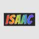 This fun, vibrant, multicolored name tag design features the common first name "ISAAC", with the letters of the name having a colourful rainbow spectrum like gradient colouring pattern, on a black coloured background. A nametag like this might be worn by an employee, a customer service representative, or a volunteer whose name is Isaac, to help identify the wearer to others. [~Z0000344]