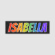 This fun, vibrant, multicolored name tag design features the common first name "ISABELLA", with the letters of the name having a colourful rainbow spectrum like gradient colouring pattern, on a black coloured background. A nametag like this might be worn by a customer service representative, a staff member, or an employee whose given name is Isabella, to help identify the wearer to customers or other people. [~Z0000344]