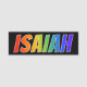 This fun, vibrant, multicolored name tag design features the common first name "ISAIAH", with the letters of the name having a colourful rainbow spectrum like gradient colouring pattern, on a black coloured background. A nametag like this might be worn by an employee, a volunteer, or a staff member named Isaiah, to help identify the wearer to others. [~Z0000344]