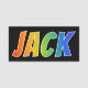 This fun, vibrant, multicolored name tag design features the common first name "JACK", with the letters of the name having a colourful rainbow spectrum like gradient colouring pattern, on a black coloured background. A nametag like this might be worn by a volunteer, an employee, or a staff member named Jack, to help identify the wearer to others. [~Z0000344]