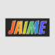 This fun, vibrant, multicolored name tag design features the common first name "JAIME", with the letters of the name having a colourful rainbow spectrum like gradient colouring pattern, on a black coloured background. A nametag like this might be worn by a staff member, an employee, or a customer service representative whose given name is Jaime, to help identify the wearer to customers or other people. [~Z0000344]