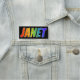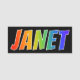 This fun, vibrant, multicolored name tag design features the common first name "JANET", with the letters of the name having a colourful rainbow spectrum like gradient colouring pattern, on a black coloured background. A nametag like this might be worn by a staff member, an employee, or a customer service representative whose given name is Janet, to help identify the wearer to others. [~Z0000344]