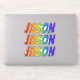 This fun, vibrant, and multicolored sticker design features the common first name or given name "JASON", with the letters of the name having a colourful rainbow spectrum like gradient colouring pattern. It might be a fun gift to give to somebody whose first name is Jason. [~Z0000361]
