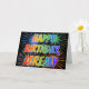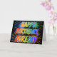 This fun, vibrant, multicolored birthday greeting card design features the message "HAPPY BIRTHDAY," and the common first name "JEREMY" with the letters having a colorful rainbow spectrum like gradient coloring pattern. The background of the front also features a colorful pattern inspired by the appearance of bursting celebratory fireworks. The inside features a custom greeting message, or could perhaps be cleared and left blank if a message is to be written by hand instead. A birthday greeting card like this could be a fun way to send a customizable birthday greeting message to somebody named Jeremy. [~Z0000350]