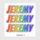 This fun, exciting, and vibrant sticker design features the common first name or given name "JEREMY", with the letters of the name having a colourful rainbow spectrum inspired gradient colouring pattern. It might be a fun present to give to somebody named Jeremy. [~Z0000361]