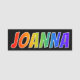 This fun, vibrant, multicolored name tag design features the common first name "JOANNA", with the letters of the name having a colourful rainbow spectrum like gradient colouring pattern, on a black coloured background. A nametag like this might be worn by a volunteer, a staff member, or an employee who is named Joanna, to help identify the wearer to customers or other people. [~Z0000344]