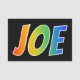 This fun, vibrant, multicolored name tag design features the common first name "JOE", with the letters of the name having a colourful rainbow spectrum like gradient colouring pattern, on a black coloured background. A nametag like this might be worn by a staff member, a volunteer, or an employee whose first name is Joe, to help identify the wearer to others. [~Z0000344]