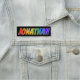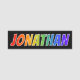 This fun, vibrant, multicolored name tag design features the common first name "JONATHAN", with the letters of the name having a colourful rainbow spectrum like gradient colouring pattern, on a black coloured background. A nametag like this might be worn by a customer service representative, an employee, or a volunteer whose given name is Jonathan, to help identify the wearer to others. [~Z0000344]