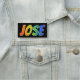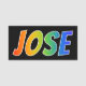 This fun, vibrant, multicolored name tag design features the common first name "JOSE", with the letters of the name having a colourful rainbow spectrum like gradient colouring pattern, on a black coloured background. A nametag like this might be worn by a customer service representative, a volunteer, or a staff member whose first name is Jose, to help identify the wearer to customers or other people. [~Z0000344]
