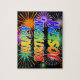 This fun, exciting, birthday-themed jigsaw puzzle design has the message "HAPPY BIRTHDAY, JOSEPH" having a colourful rainbow spectrum inspired gradient pattern, and a lively bursting celebratory fireworks inspired background pattern. An exciting puzzle like this might be a fun way to send birthday wishes to somebody named Joseph. [~Z0000465]