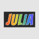 This fun, vibrant, multicolored name tag design features the common first name "JULIA", with the letters of the name having a colourful rainbow spectrum like gradient colouring pattern, on a black coloured background. A nametag like this might be worn by a customer service representative, a volunteer, or a staff member named Julia, to help identify the wearer to customers or other people. [~Z0000344]