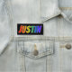 This fun, vibrant, multicolored name tag design features the common first name "JUSTIN", with the letters of the name having a colourful rainbow spectrum like gradient colouring pattern, on a black coloured background. A nametag like this might be worn by a customer service representative, an employee, or a staff member whose first name is Justin, to help identify the wearer to customers or other people. [~Z0000344]