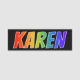 This fun, vibrant, multicolored name tag design features the common first name "KAREN", with the letters of the name having a colourful rainbow spectrum like gradient colouring pattern, on a black coloured background. A nametag like this might be worn by an employee, a customer service representative, or a staff member whose first name is Karen, to help identify the wearer to others. [~Z0000344]