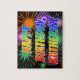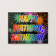This vibrant, exciting, birthday-themed jigsaw puzzle design has the message "HAPPY BIRTHDAY, KATHERINE" having a colorful rainbow spectrum inspired gradient pattern, and a lively bursting celebratory fireworks inspired background pattern. A vibrant puzzle like this might be a fun way to send birthday wishes to somebody named Katherine. [~Z0000465]
