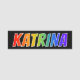 This fun, vibrant, multicolored name tag design features the common first name "KATRINA", with the letters of the name having a colourful rainbow spectrum like gradient colouring pattern, on a black coloured background. A nametag like this might be worn by a customer service representative, a staff member, or an employee whose given name is Katrina, to help identify the wearer to others. [~Z0000344]