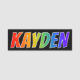 This fun, vibrant, multicolored name tag design features the common first name "KAYDEN", with the letters of the name having a colourful rainbow spectrum like gradient colouring pattern, on a black coloured background. A nametag like this might be worn by a staff member, a customer service representative, or an employee named Kayden, to help identify the wearer to others. [~Z0000344]