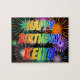 This vibrant and fun birthday-themed jigsaw puzzle design has the message "HAPPY BIRTHDAY, KEITH" having a colourful rainbow spectrum inspired gradient pattern, and an exciting bursting celebratory fireworks inspired background pattern. A vibrant puzzle like this might be used to send a birthday greeting message to somebody named Keith. [~Z0000465]