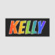 This fun, vibrant, multicolored name tag design features the common first name "KELLY", with the letters of the name having a colourful rainbow spectrum like gradient colouring pattern, on a black coloured background. A nametag like this might be worn by a customer service representative, a volunteer, or a staff member whose given name is Kelly, to help identify the wearer to customers or other people. [~Z0000344]