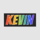 This fun, vibrant, multicolored name tag design features the common first name "KEVIN", with the letters of the name having a colourful rainbow spectrum like gradient colouring pattern, on a black coloured background. A nametag like this might be worn by an employee, a volunteer, or a customer service representative whose given name is Kevin, to help identify the wearer to customers or other people. [~Z0000344]