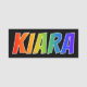 This fun, vibrant, multicolored name tag design features the common first name "KIARA", with the letters of the name having a colourful rainbow spectrum like gradient colouring pattern, on a black coloured background. A nametag like this might be worn by a customer service representative, a staff member, or a volunteer whose first name is Kiara, to help identify the wearer to others. [~Z0000344]