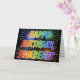 This fun, vibrant, multicolored birthday greeting card design features the message "HAPPY BIRTHDAY," and the common first name "KIMBERLY" with the letters having a colourful rainbow spectrum like gradient colouring pattern. The background of the front also features a colourful pattern inspired by the appearance of bursting fireworks. The inside features a customised greeting message, or could perhaps be cleared and left blank if a message is to be written by hand instead. A greeting card like this could be a fun way to celebrate the birthday of somebody named Kimberly. [~Z0000350]