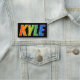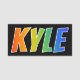 This fun, vibrant, multicolored name tag design features the common first name "KYLE", with the letters of the name having a colourful rainbow spectrum like gradient colouring pattern, on a black coloured background. A nametag like this might be worn by a customer service representative, a staff member, or a volunteer whose name is Kyle, to help identify the wearer to customers or other people. [~Z0000344]