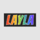 This fun, vibrant, multicolored name tag design features the common first name "LAYLA", with the letters of the name having a colourful rainbow spectrum like gradient colouring pattern, on a black coloured background. A nametag like this might be worn by a customer service representative, a volunteer, or a staff member whose name is Layla, to help identify the wearer to others. [~Z0000344]