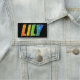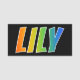 This fun, vibrant, multicolored name tag design features the common first name "LILY", with the letters of the name having a colourful rainbow spectrum like gradient colouring pattern, on a black coloured background. A nametag like this might be worn by a staff member, a volunteer, or an employee named Lily, to help identify the wearer to others. [~Z0000344]